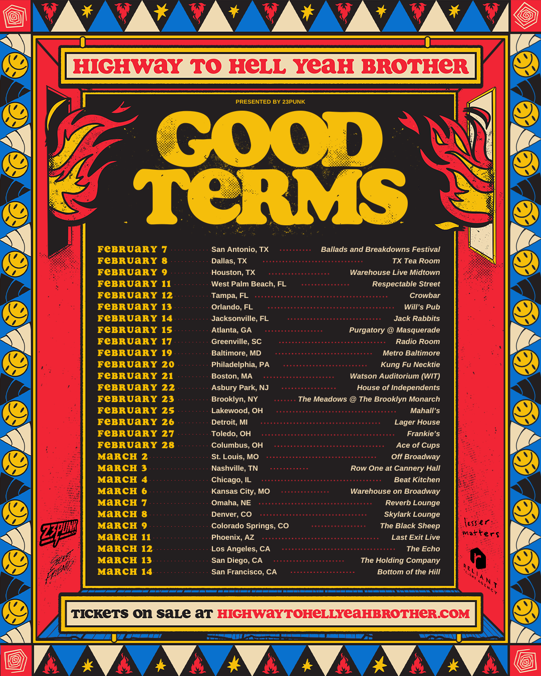 Good Terms (Los Angeles, CA) are back with a new album ‘Burnout’, it is the sound of a band dismantling any preconception of who they are and what they sound like, putting every musical option back on the table and diving headfirst into every unorthodox influence. Good Terms formulated 12 songs that are completely unique from each other and then sowed every piece back together into one cohesive work with multiple intertwining lyrical themes of identity, alienation, and perspective. ‘Burnout” is anxious, hopeful, confused, angsty, longing, joyous, loving, regretful, pissed, wistful, sincere, and cathartic. It juxtaposes moments that feel like the sonic recreation of the dread meme with others that feel like the triumphant ending scene of The Land Before Time. This album will have you simultaneously clearing your sinuses from extreme levels of stank face, dusting off your old air guitar, wanting to do spin kicks in your living room, reconnecting with your younger self, and wishing that you took an extra bite of your crazy aunt’s special brownie. It’s mosh ready, 420 friendly, and hell yeah brother approved. ‘Burnout’ is supported with nearly half their album spinning on stations as SiriusXM Faction Punk and idobi Radio on rotation and North American tours including a recent sold out direct support tour with Hawthorne Heights and also an upcoming west coast tour with Driveways beginning February 18 2025 in San Diego, CA. The album began to take shape when the song "Cough" took a viral whirlwind leap in July 2024 and has soared as the band's go-to jam. You can find 'Burnout' in vinyl shops as Banquet Records, Rough Trade (EU/UK), Amoeba Records, Fingerprints Records and many more.